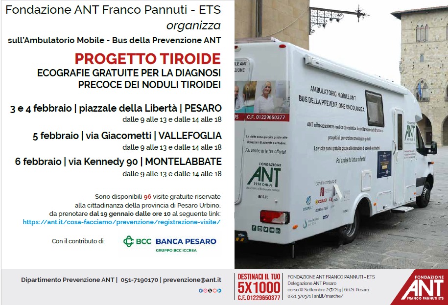 L’iniziativa rientra nel Progetto Tiroide di ANT e ha l’obiettivo di promuovere la diagnosi precoce, attraverso visite specialistiche ed ecografie tiroidee, fondamentali per individuare tempestivamente eventuali noduli sospetti. I tumori della tiroide, infatti, se diagnosticati in fase iniziale, presentano nella maggior parte dei casi alte probabilità di cura: la prevenzione rappresenta quindi un passo fondamentale per la tutela della salute.