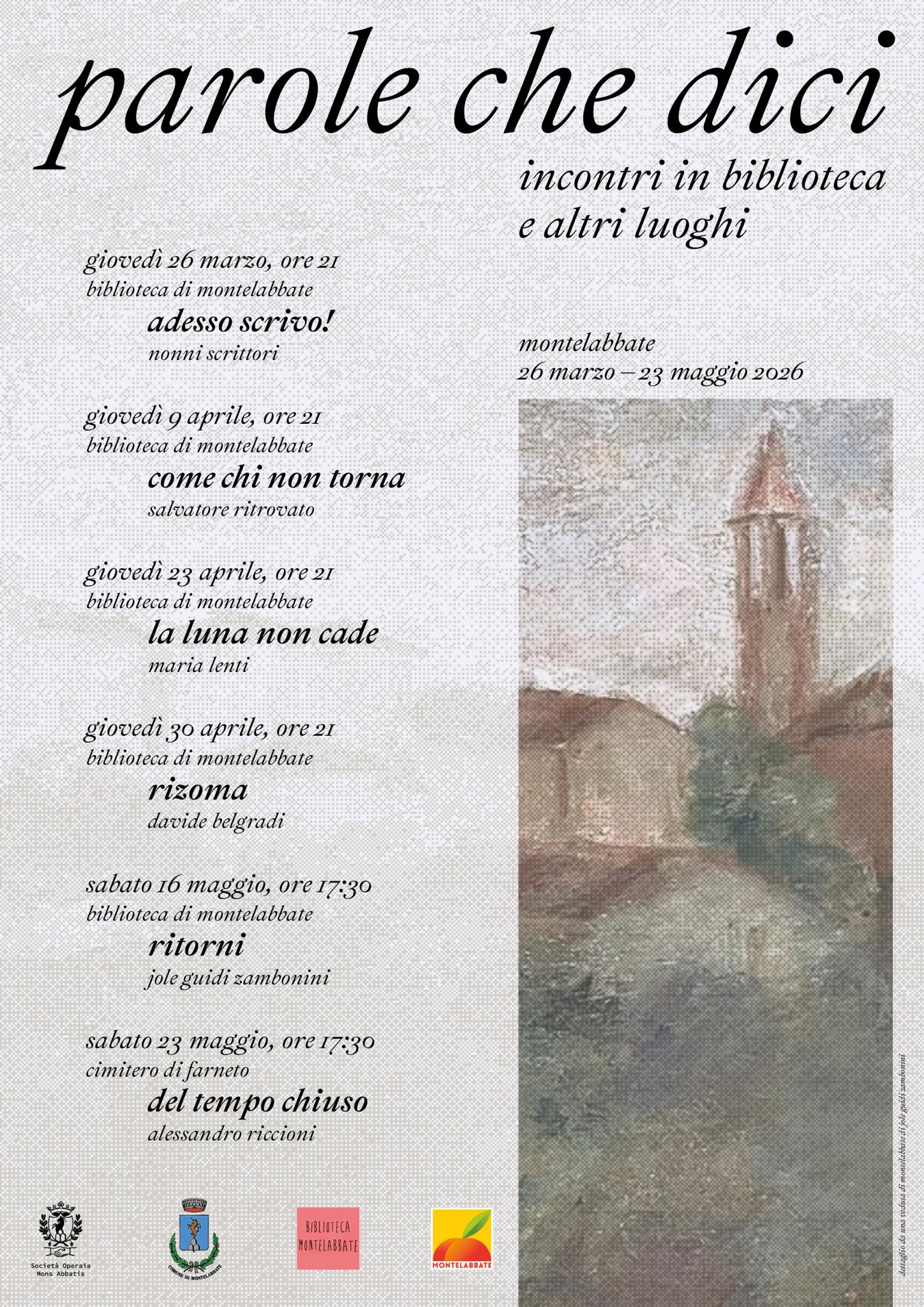 “Parole che dici” è una rassegna di incontri che celebra la parola scritta in tutte le sue forme: memorie, poesia, narrativa e saggistica in un percorso pensato per dare spazio alle voci del nostro territorio e non solo. La rassegna, composta da cinque appuntamenti, è organizzata dal Comune di Montelabbate – Assessorato alle Politiche culturali – insieme alla Biblioteca comunale, un servizio molto attivo e frequentato, punto di riferimento per la vita culturale della comunità.